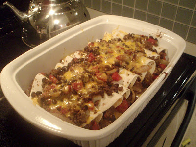 Warm tortillas to make them easier to roll. Divide the beef mixture and 1/4 cup of cheese among the tortillas and place seam side down in rectangular baking dish. Pour remaining sauce on top and bake uncovered for about 15 minutes. Sprinkle on remaining cheese and bake another 5 minutes or until cheese is melted. Make 8 servings.